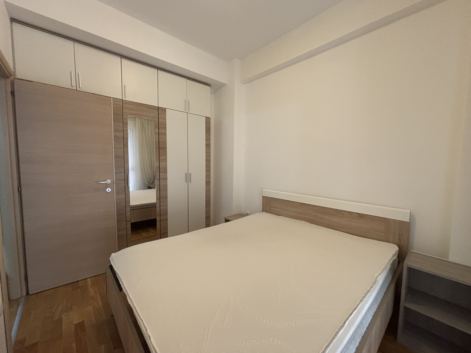 It is oriented towards the courtyard side of the building and has access to the terrace from the living room and from the bedroom.