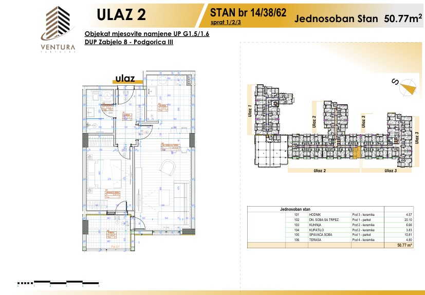 Prodaje se jednosoban stan u izgradnji u novom kompleksu Ventura Partners na Zabjelu u ulici Vojislavljevića. Stan se nalazi na drugom spratu zgrade i okrenut je prema dvorištu. Struktura stana je sljedeća: dnevna soba sa kuhinjom i trpezarijom, spavaća soba, hodnik, kupatilo i terasa. Projektovana kvadratura stana je 50.77 m2.