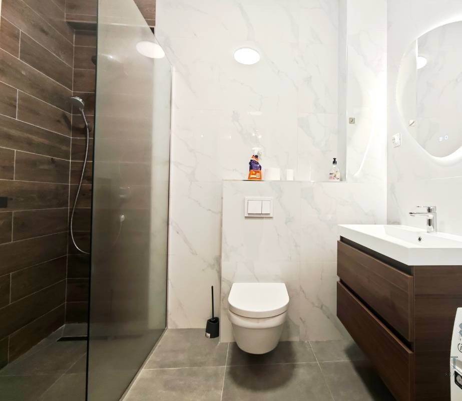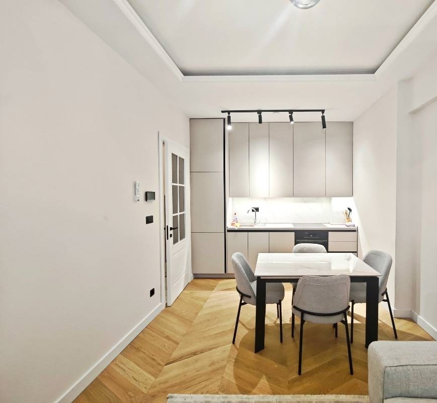 Stan je moderno namješten i opremljen savremenim uređajima, uključujući mašinu za suđe, mašinu za pranje i sušenje veša, podno grijanje u kupatilu, kao i napredni sistem smart stan kontrole. Ovaj sistem omogućava upravljanje klimom, rasvjetom, bojlerom, roletnama i kupatilom putem dugmadi ili mobilnog telefona.